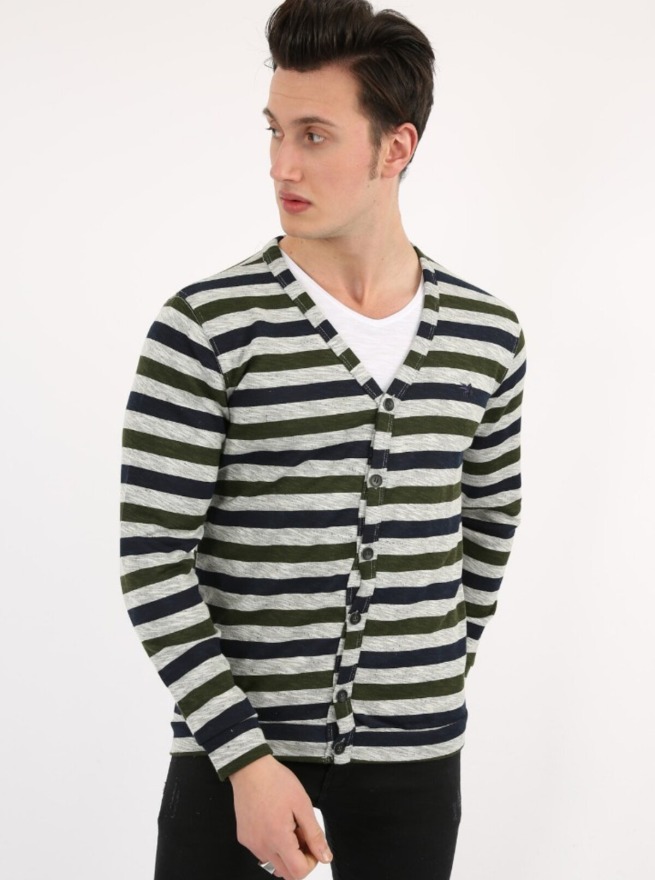 Düğmeli Çizgili Erkek Günlük Hırka - L